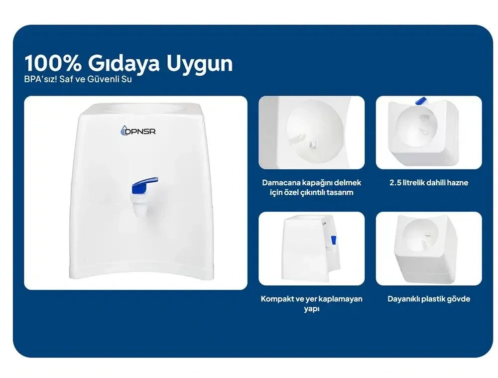 Ürünü Neden Tercih Etmelisiniz? Enerjiye ihtiyaç duymaz – Elektriksiz tasarımıyla her yerde kullanıma uygundur. 2.5 Litre iç haznesiyle ideal kullanım – Günlük tüketim için yeterli kapasite. Güçlü su akışı – Diğer basmalı sistemlere göre daha hızlı ve kolay akış sağlar. Kurulumu son derece basit – Alet, tornavida, karmaşa yok. Tüm damacanalarla uyumlu (5L - 19L) – Ofis, ev, piknik, balkon fark etmez, her yerde çalışır. Hijyenik ve sağlıklı malzeme – BPA içermez, bakteri oluşumunu önleyen yapıya sahiptir. Şeffaf kapak tasarımı – Suyun ya da meşrubatın ne kadar kaldığını kolayca görün. Koku ve mantar oluşumunu önler – Temiz ve güvenli kullanım sunar. Dayanıklı ve çevre dostu – Uzun ömürlü yapısıyla doğaya katkı sağlar. Taşınabilir tasarım (28x24 cm) – Kamp, yazlık, ofis, piknik, okul gibi her alanda yanınızda.