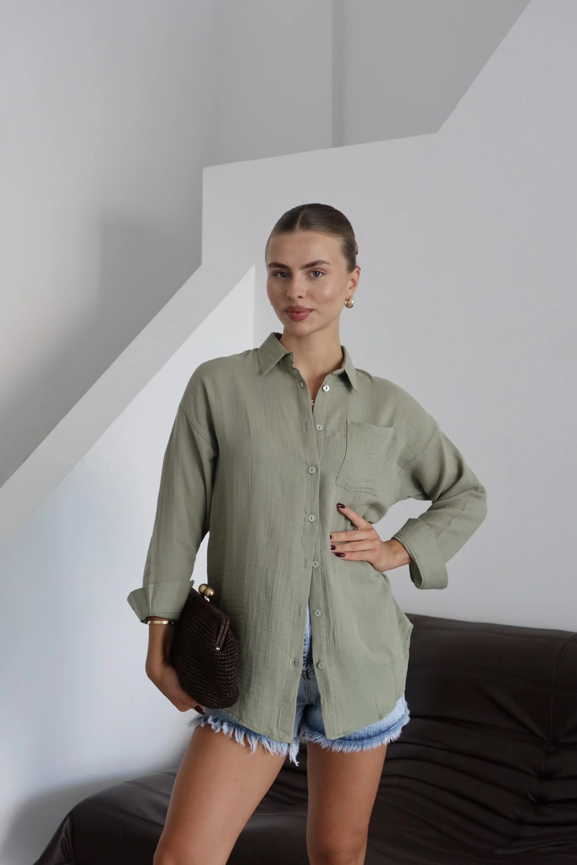 Bu haki rengiyle şıklığı ve rahatlığı bir arada sunan tek cepli müslin gömlek, gardırobunuzun vazgeçilmezi olmaya aday! Yuvarlak yakalı ve düğmeli olan bu gömleğin özellikleri şöyle:
