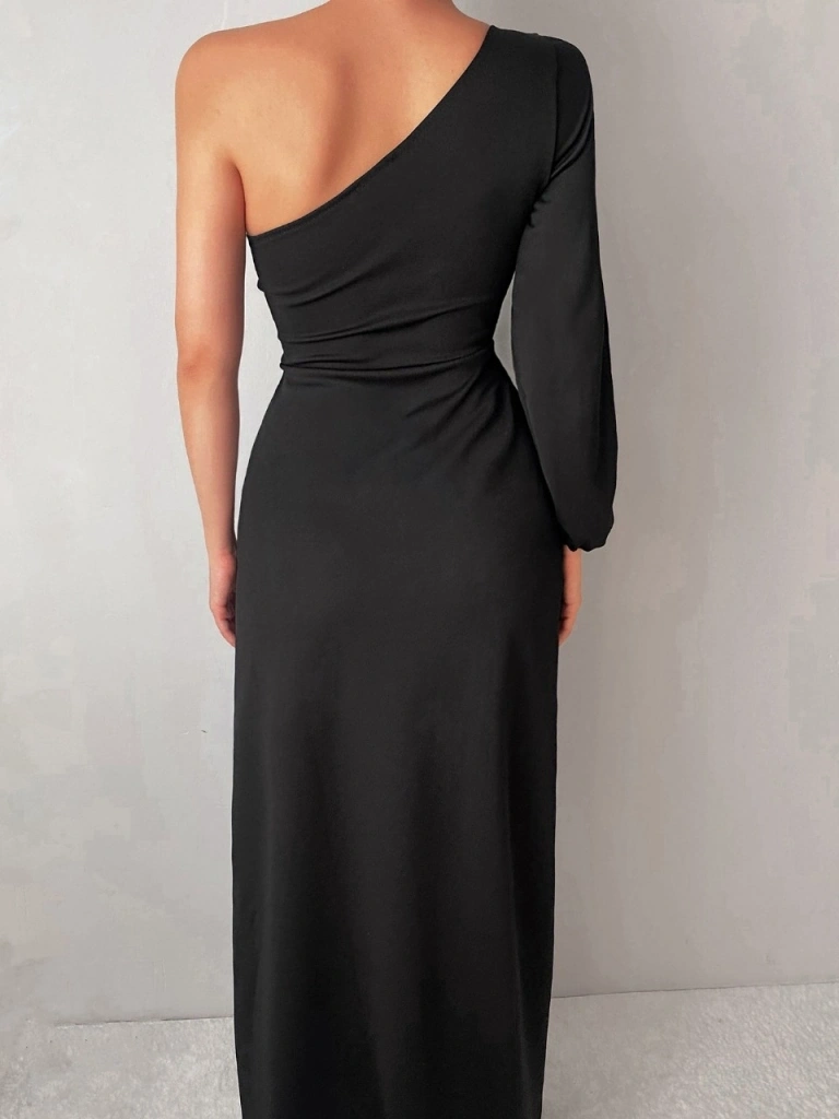 Tek Omuz Açık Derin Yırtmaçlı Krep Tam Boy Elbise