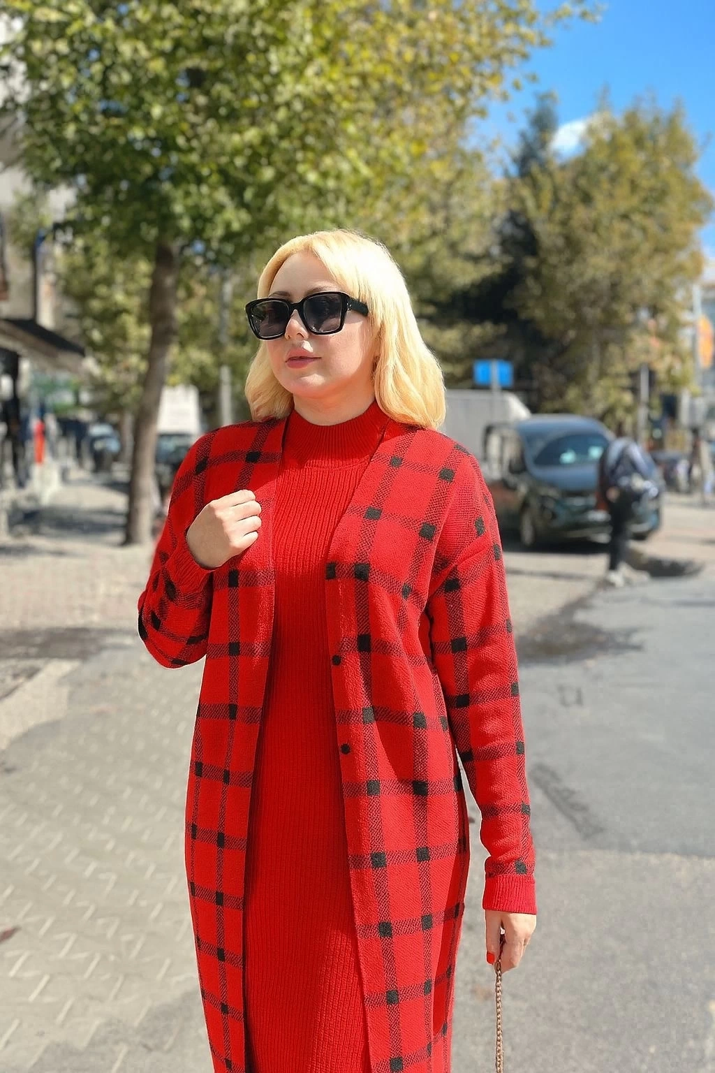 Triko Hırka elbise ikili takım kırmızı, gardırobunuzun vazgeçilmezi olmaya aday!