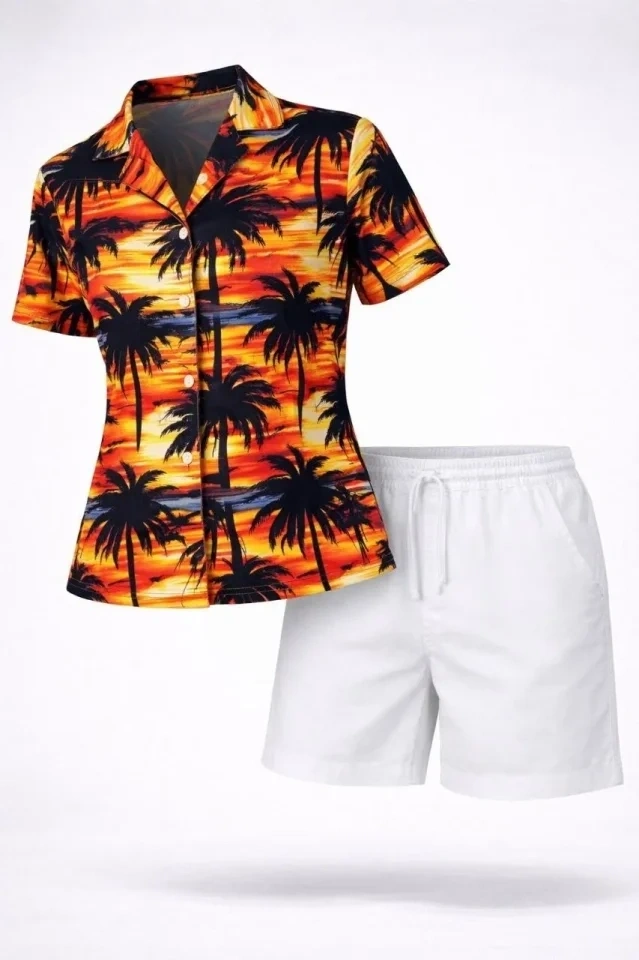 Tropikal Palmiye Desenli Gömlek Şort Takım Yazlık Rahat Kalıp - Desenli