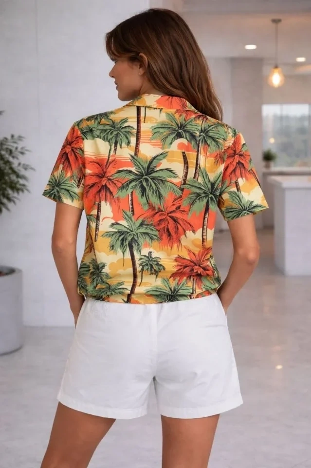 Tropikal Palmiye Desenli Kısa Kol Gömlek Şort Takım Yazlık Rahat - Desenli