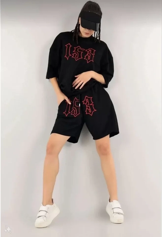 Unisex Nakış İşlemeli Şort Takım - Siyah