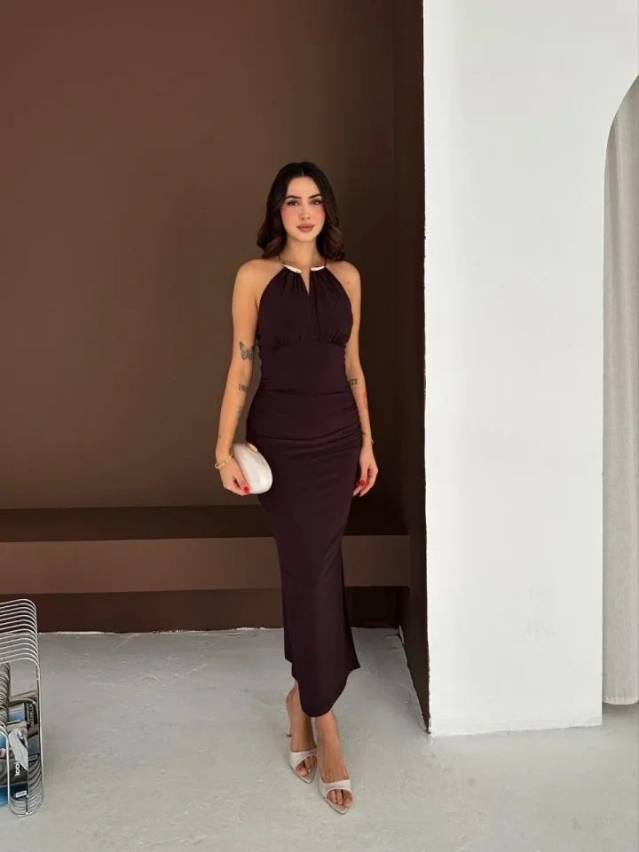 Uzun Abiye Elbise Yırtmaçlı Sırt Dekolteli Şık Gece Elbisesi - Kahverengi