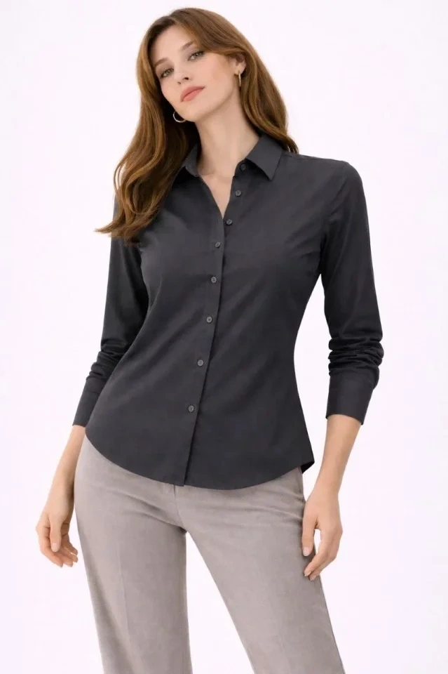 Uzun Kollu Gömlek Düğmeli Klasik Yaka Günlük Ve Ofis Şıklığına Uygun - Füme