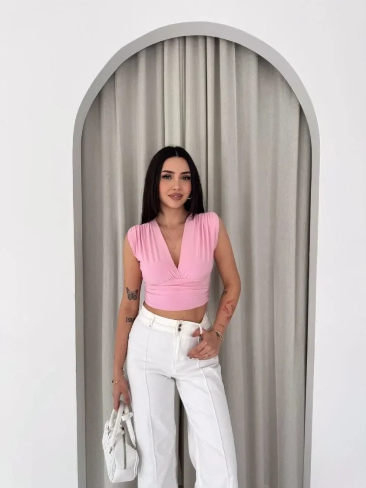 Vatkalı Kolsuz V Yaka Drapeli Crop Bluz Likralı Fit - Pembe