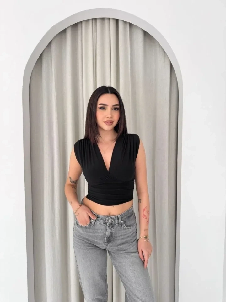 Vatkalı Kolsuz V Yaka Drapeli Crop Bluz Likralı Fit - Siyah