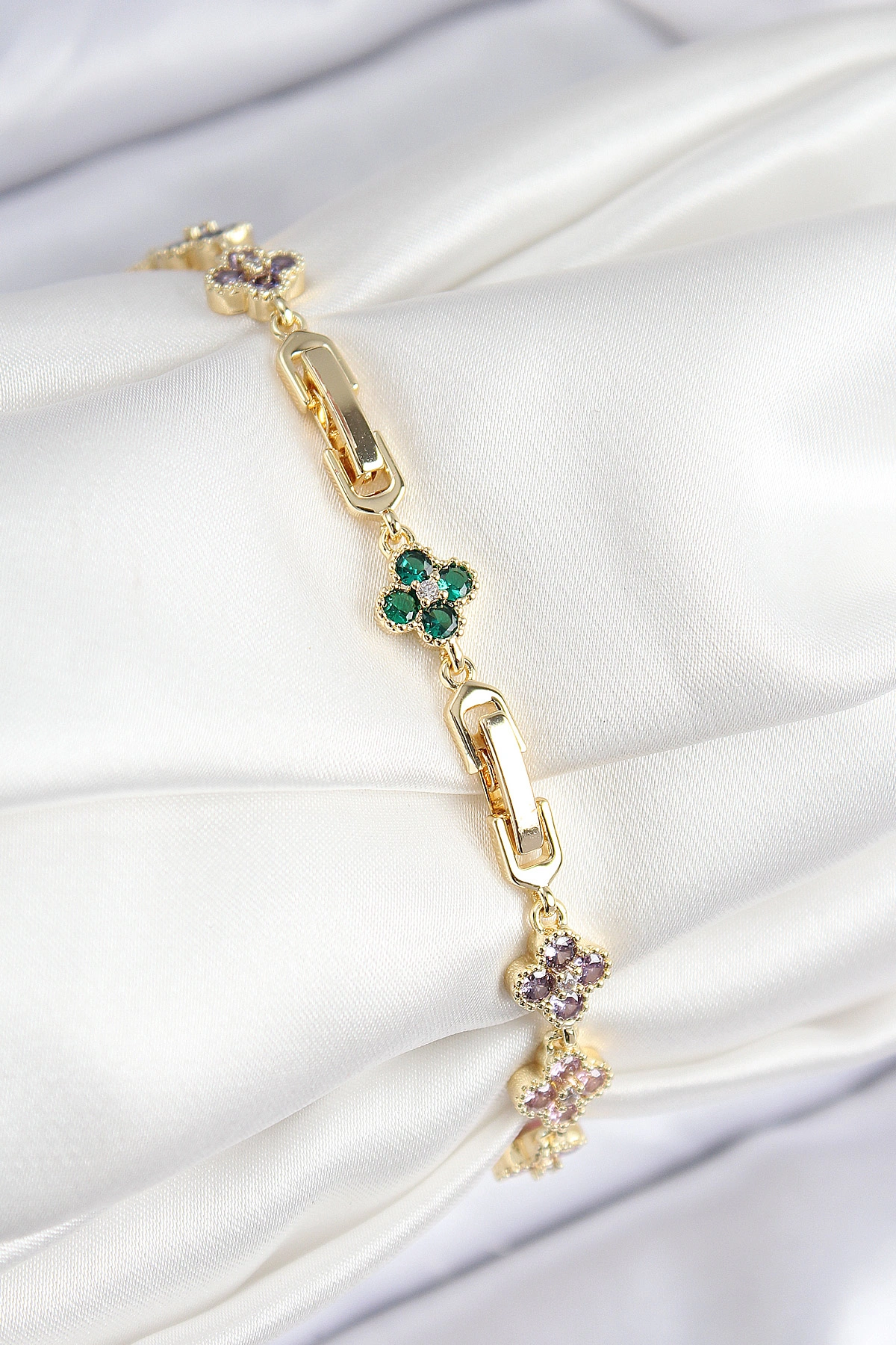 VIP Pirinç Renkli Zirkon Taşlı Yonca Model Gold Renk Kadın Bileklik