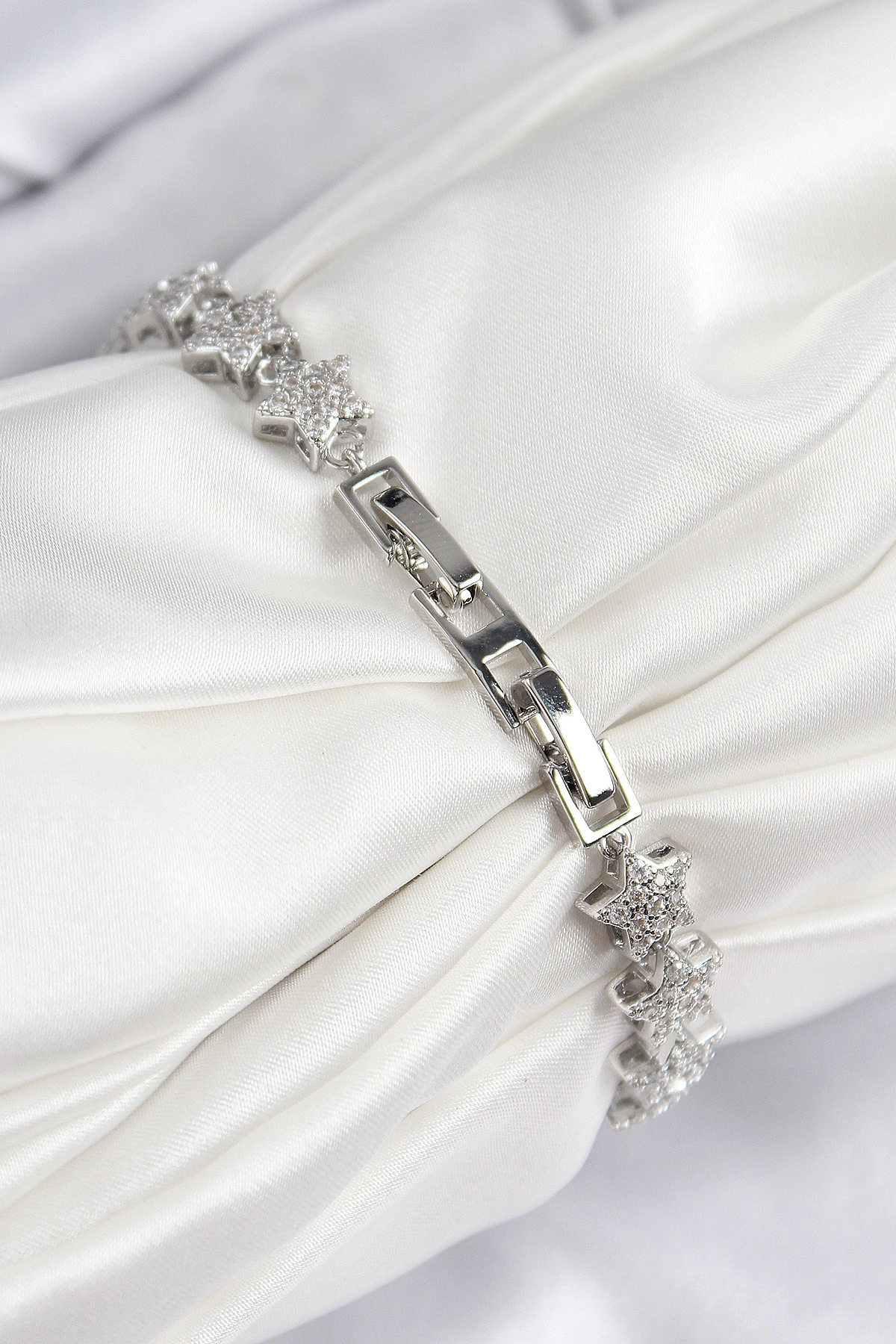 VIP Seri Pirinç Zirkon Taşlı Sıralı Yıldız Model Gümüş Renk Kadın Bileklik