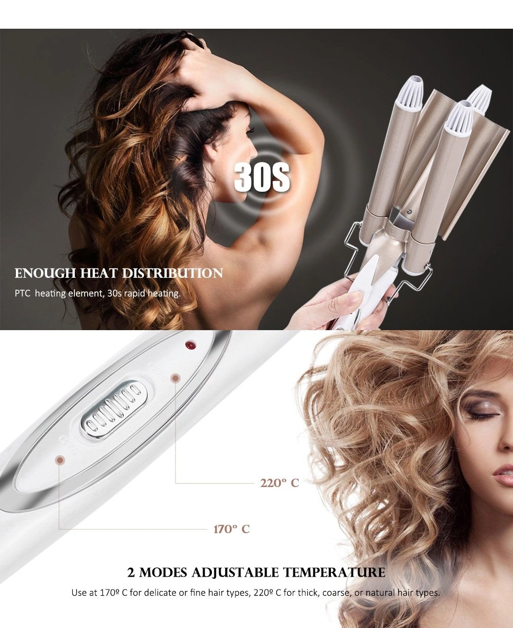 Özellikleri: Bu saç maşası, tüm gün dayanan profesyonel görünümlü bukleler oluşturmak için mükemmel bir araçtır. Turmalin seramik teknolojisini benimsemek, büyük miktarlarda negatif iyonları açığa çıkarabilir, saça verilen zararı azaltabilir, saçınızı daha sağlıklı, doğal ve saç şeklini daha kalıcı hale getirir. 3 namlulu saç kıvırıcı, seçebileceğiniz 25mm çapında varil vardır, tüm orta uzunlukta ve uzun saçlarda çalışır, flört, parti, akşam, düğün için uygun farklı boyutlarda doğal ve güzel S dalgaları yaratır. 180 ve 210, saçınıza göre doğru sıcaklığı seçmenizi, ipeksi, dalgalı, sevimli, şık ve profesyonel bir sonucun keyfini çıkarmanızı sağlar. Bu üçlü fıçı maşası, PTC ısıtma elemanına sahiptir, çok çabuk ısınır ve sıcaklığın 180 ° C iye çıkması yaklaşık 30 saniye sürer. Kaymayı önleyen tutamak ve haşlanma önleyici üst, ısı yalıtımı ön kısım braketi ile tasarlanmıştır, daha güvenli kullanın, saç kıvırıcılarının doğrudan masaüstüne temas etmesini önleyin.