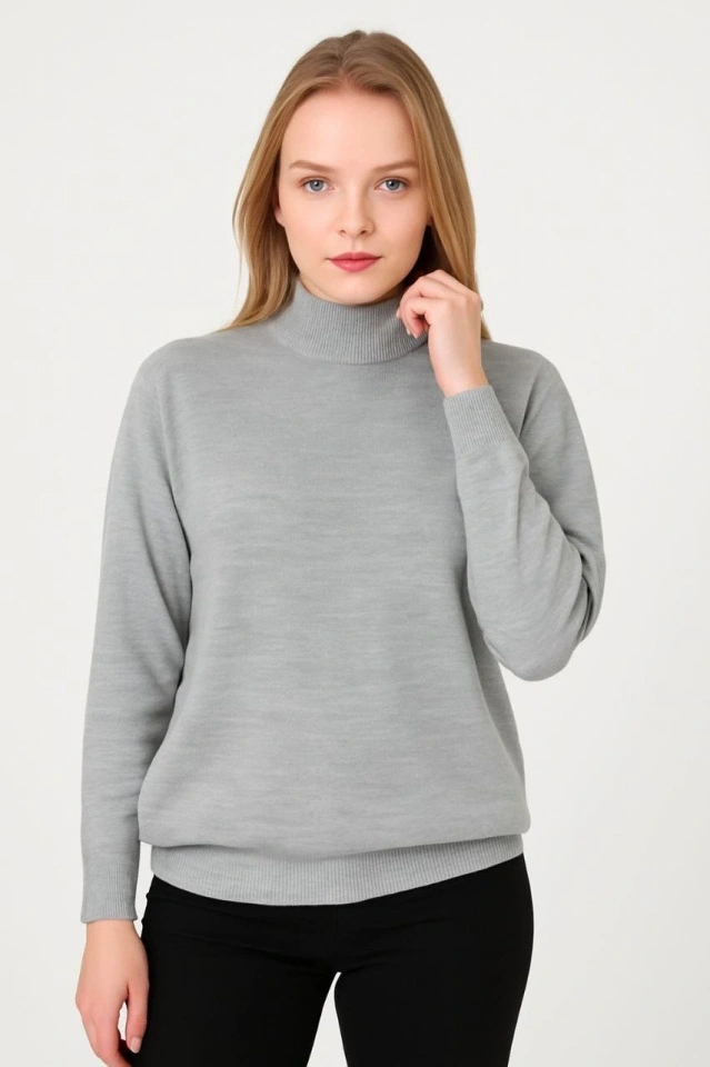 Yarım Boğaz Triko Kazak Yumuşak Dokulu Pamuklu Ince Dokuma, Uzun Kollu Rahat Regular Kalıp - Gri