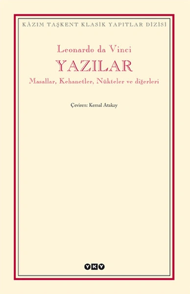 Leonardo da Vinci (1452-1519) Yazilar - Masallar, Kehanetler, Nükteler ve digerleri, dünya tarihinin büyük dehalarindan, çok yönlü Rönesans adami Da Vinci'nin dogrudan bilimsel arastirmalari ya da görsel sanatlarla ilgili yazilari disindaki bütün metinlerini bir araya getiriyor. Ilk baskisi 1952'de yapilan Yazilar, Da Vinci'nin bizzat kaleme aldigi, yaklasik yedi yüz sayfalik iki elyazmasi 1967 yilinda Madrid Ulusal Kütüphanesi'nde bulununca, genisletilmis yeni baskisiyla okurla bulusur. Madrid elyazmalarinda Da Vinci resim ve mekanik ilgisini bir yana birakir ve farkli alanlarda düsüncelerini kaleme alir.