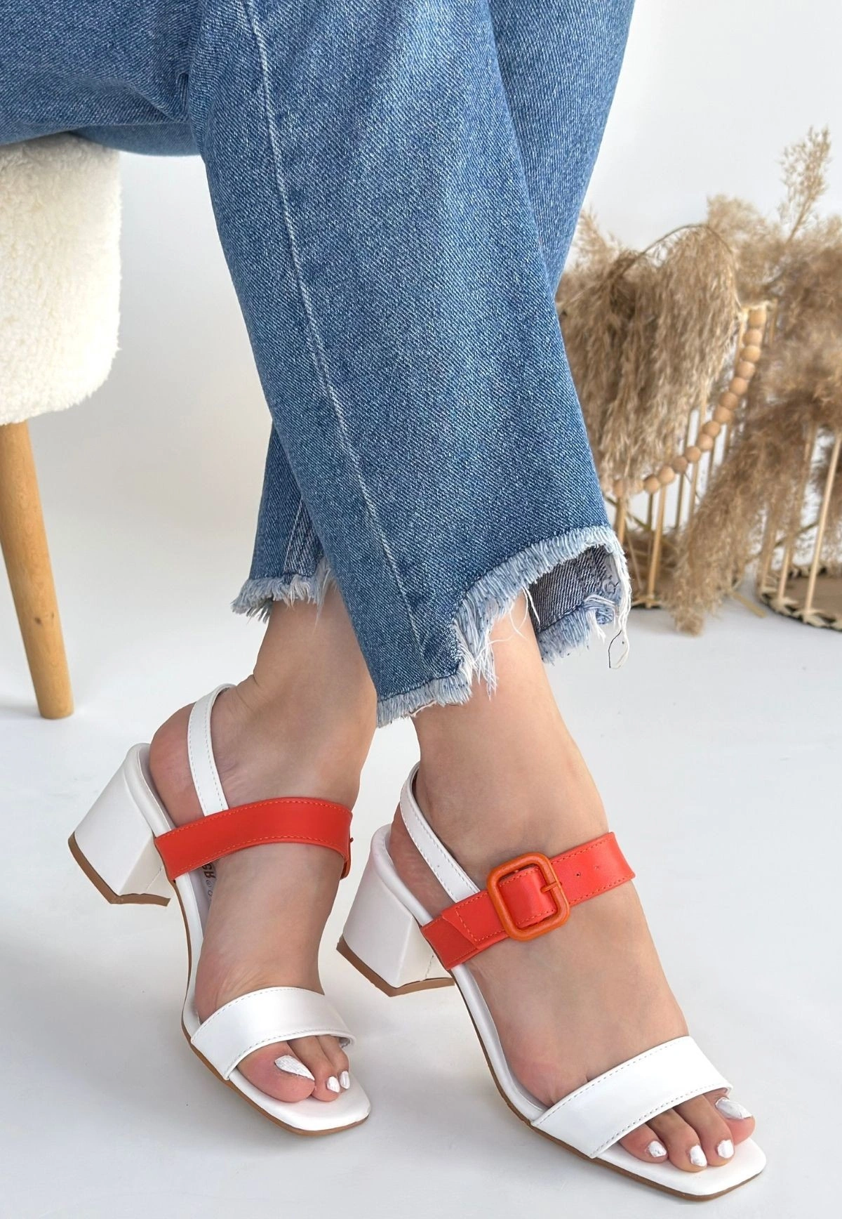 Year Beyaz Cilt Turuncu Detaylı Beyaz Topuklu Ayakkabı