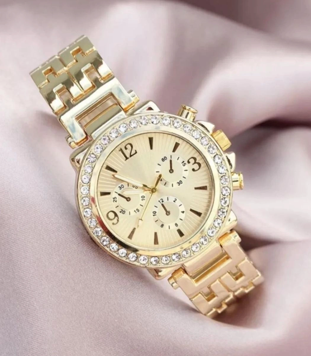 Bu özel tasarım gold renk zirkon taşlı metal bayan kol saati, hem şıklığı hem de zarafeti bir araya getiren göz alıcı bir aksesuardır. İşte bu saatin bazı önemli özellikleri: