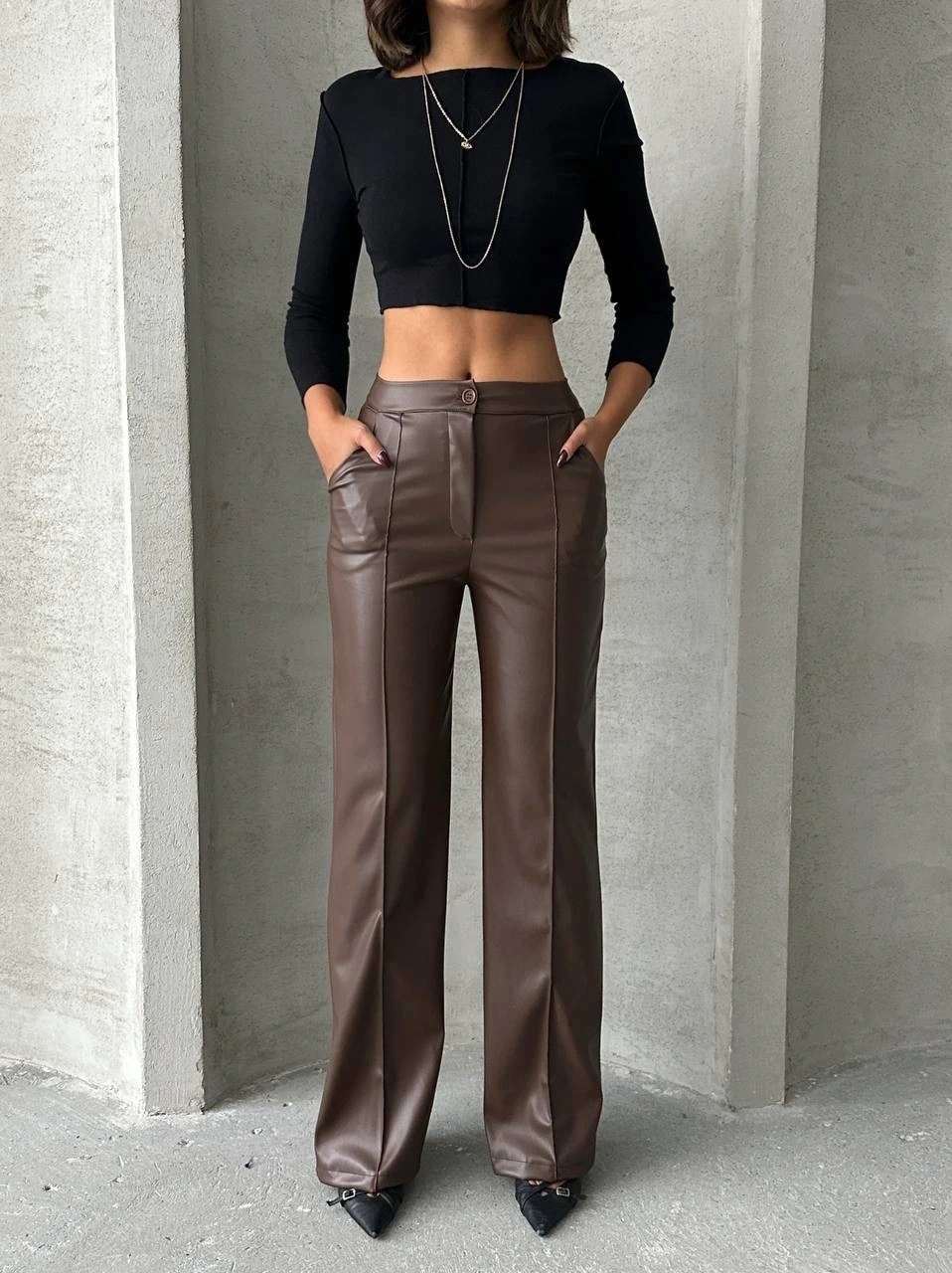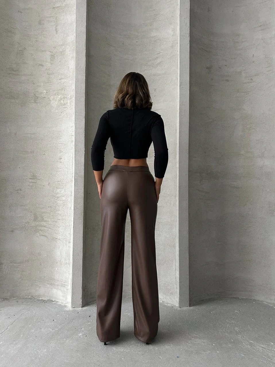 Zr markasının şık ve rahat tasarımıyla öne çıkan kahve rengi deri palazzo pantolonu, gardırobunuzun vazgeçilmezi olmaya aday!